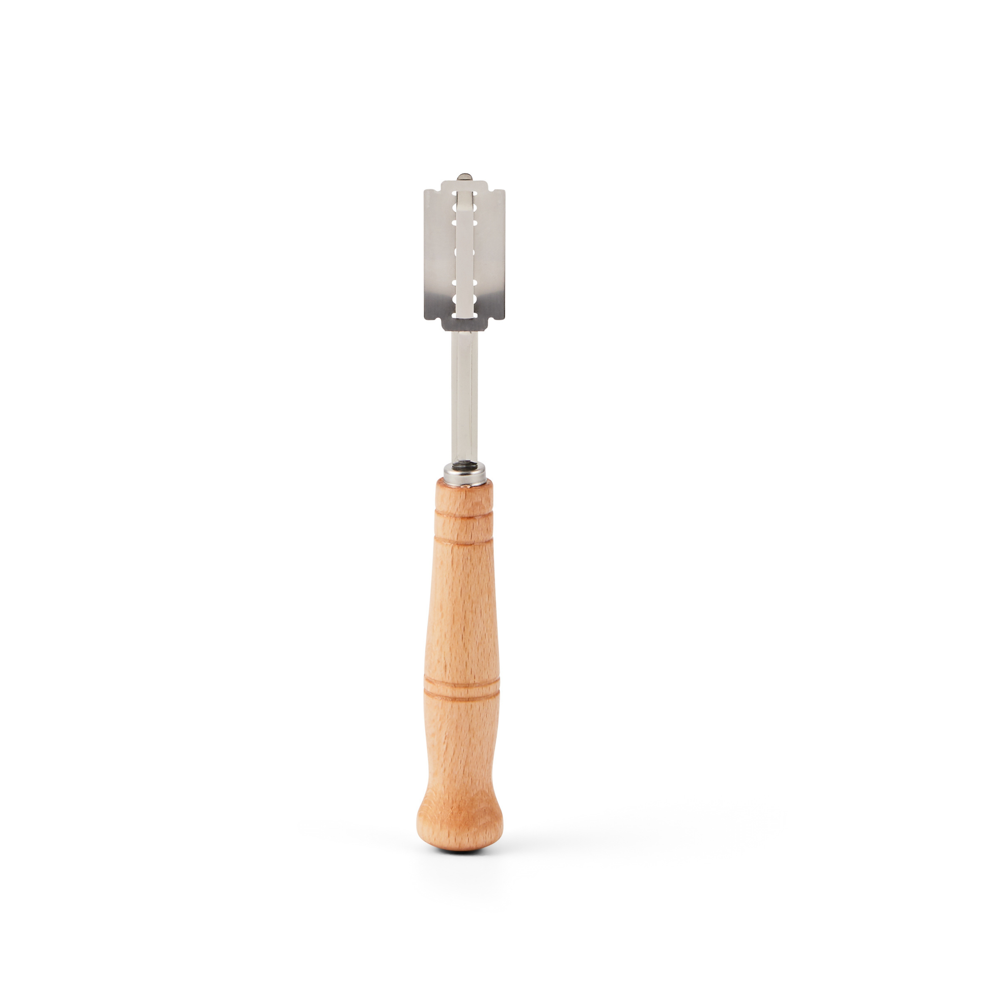 This lame (pronounced ‘Lahm’ which is a French word that means ‘blade’) is as a sourdough scorer - it slices the dough before being placed into a hot oven. Scoring dough helps the bread expand in the oven without the skin splitting randomly. You can even get creative with different scoring patterns in your sourdough bread!